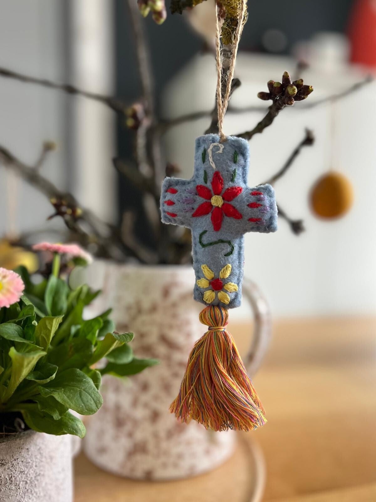Hanger kruis blauw met mooie details. Leuk om thuis op te hangen of als cadeautje voor de 1e Heilige Communie.