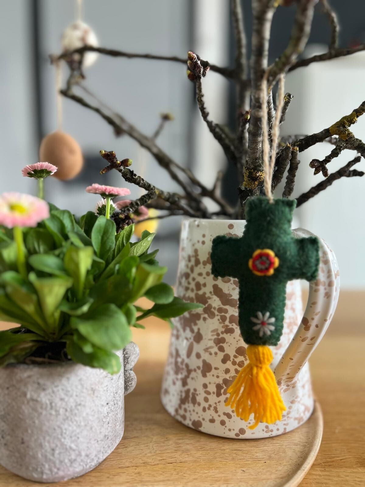 Hanger kruis groen met mooie details. Leuk om thuis op te hangen of als cadeautje voor de 1e Heilige Communie.